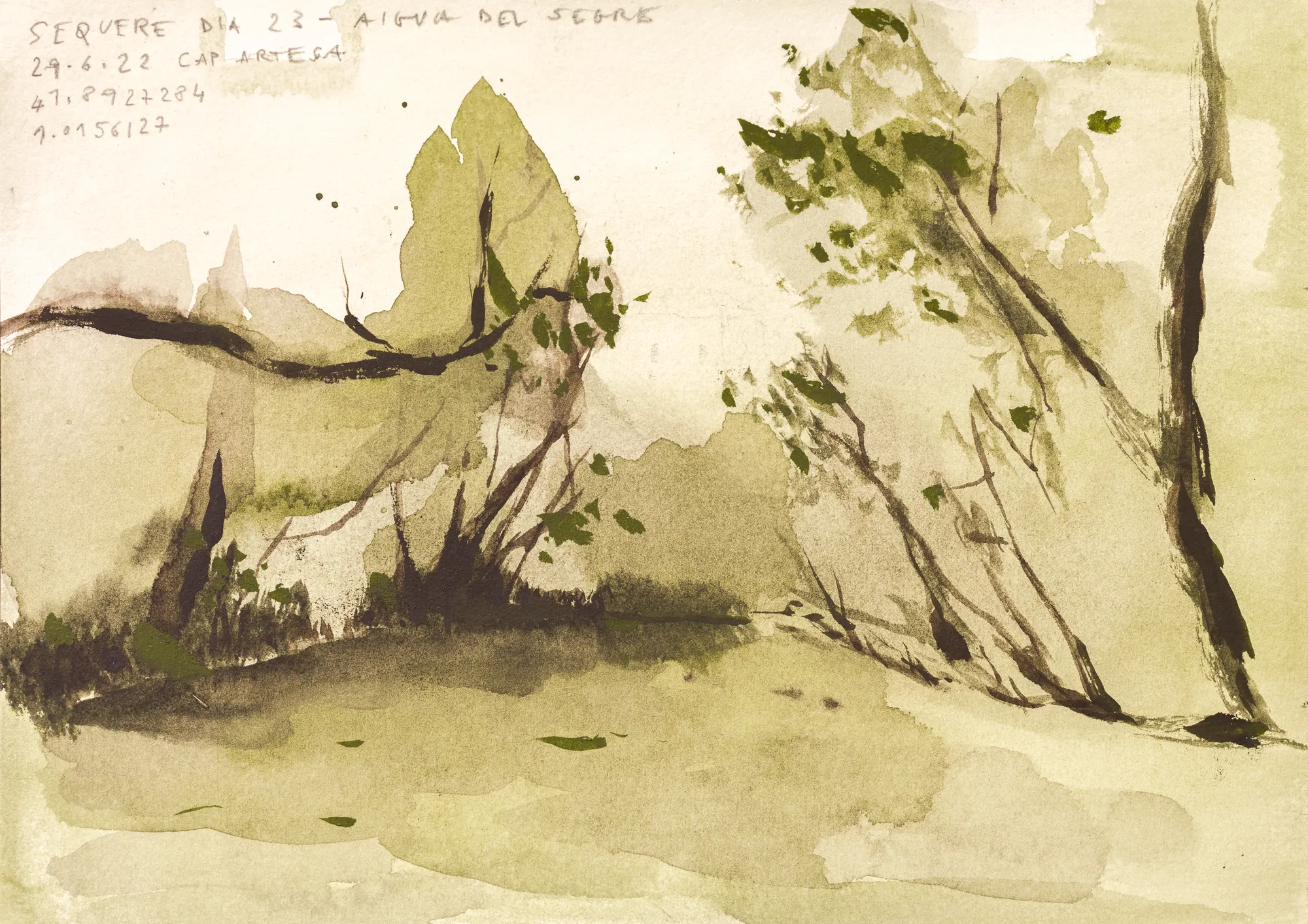 Questa serie di acquerelli, realizzati con acqua di fiume durante i percorsi di Sequere (2022) e Cos d’Ebre (2025), prova a fissare sul foglio la memoria del fiume, materialmente e simbolicamente.