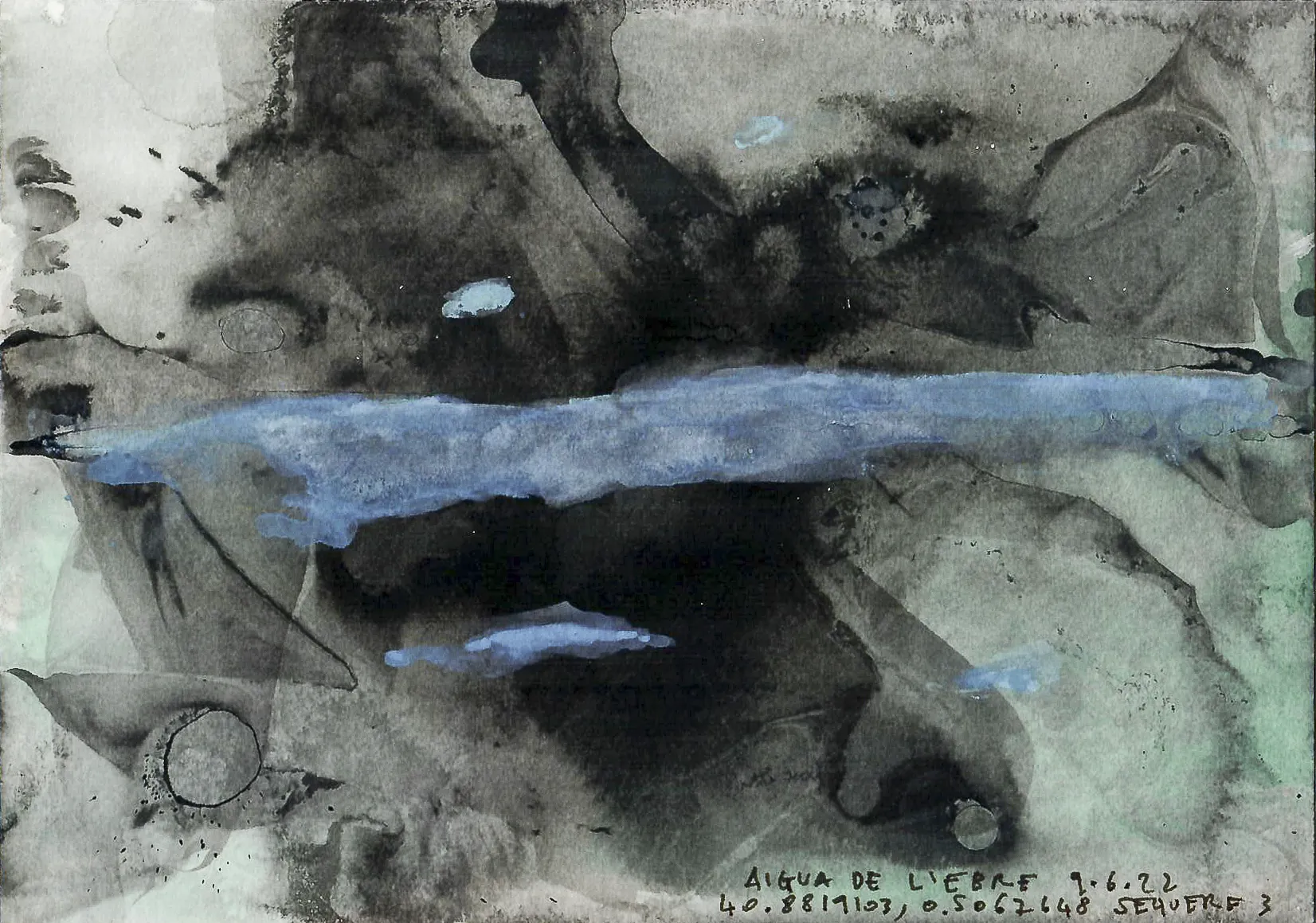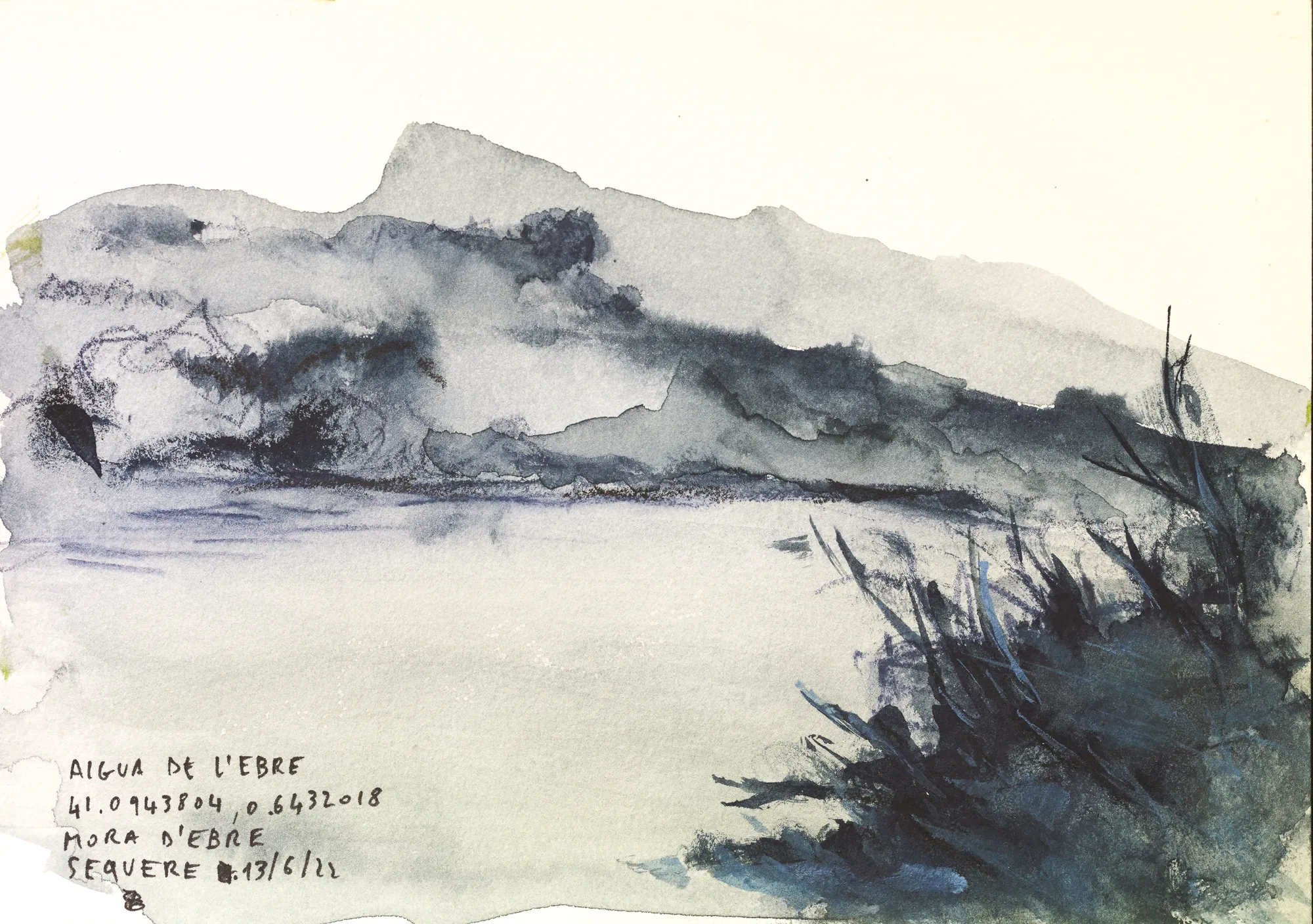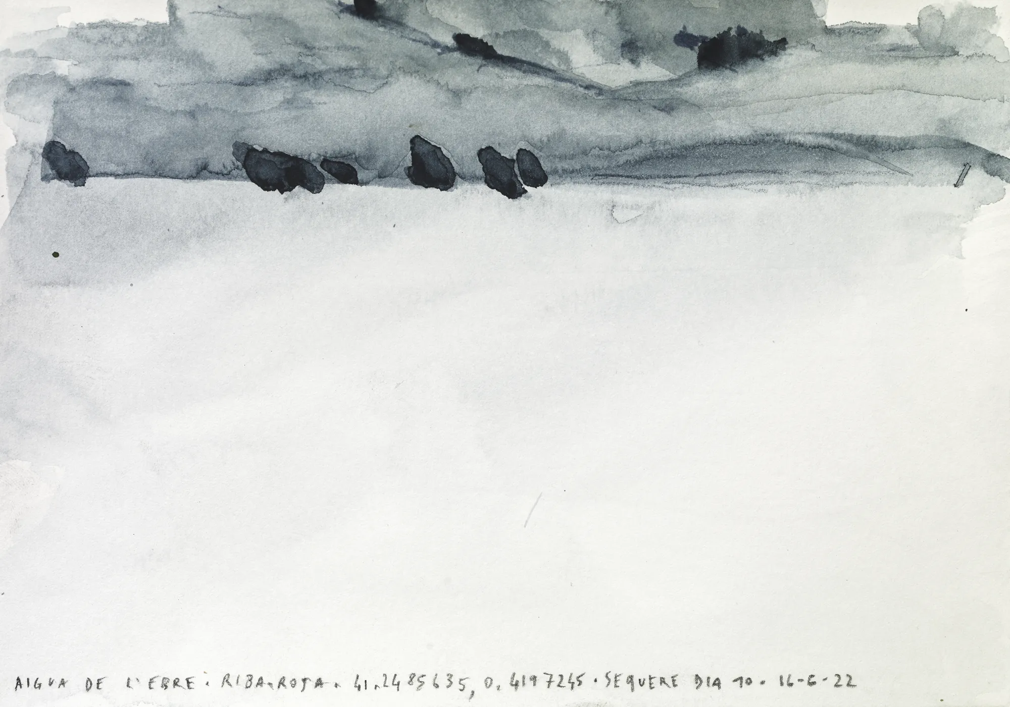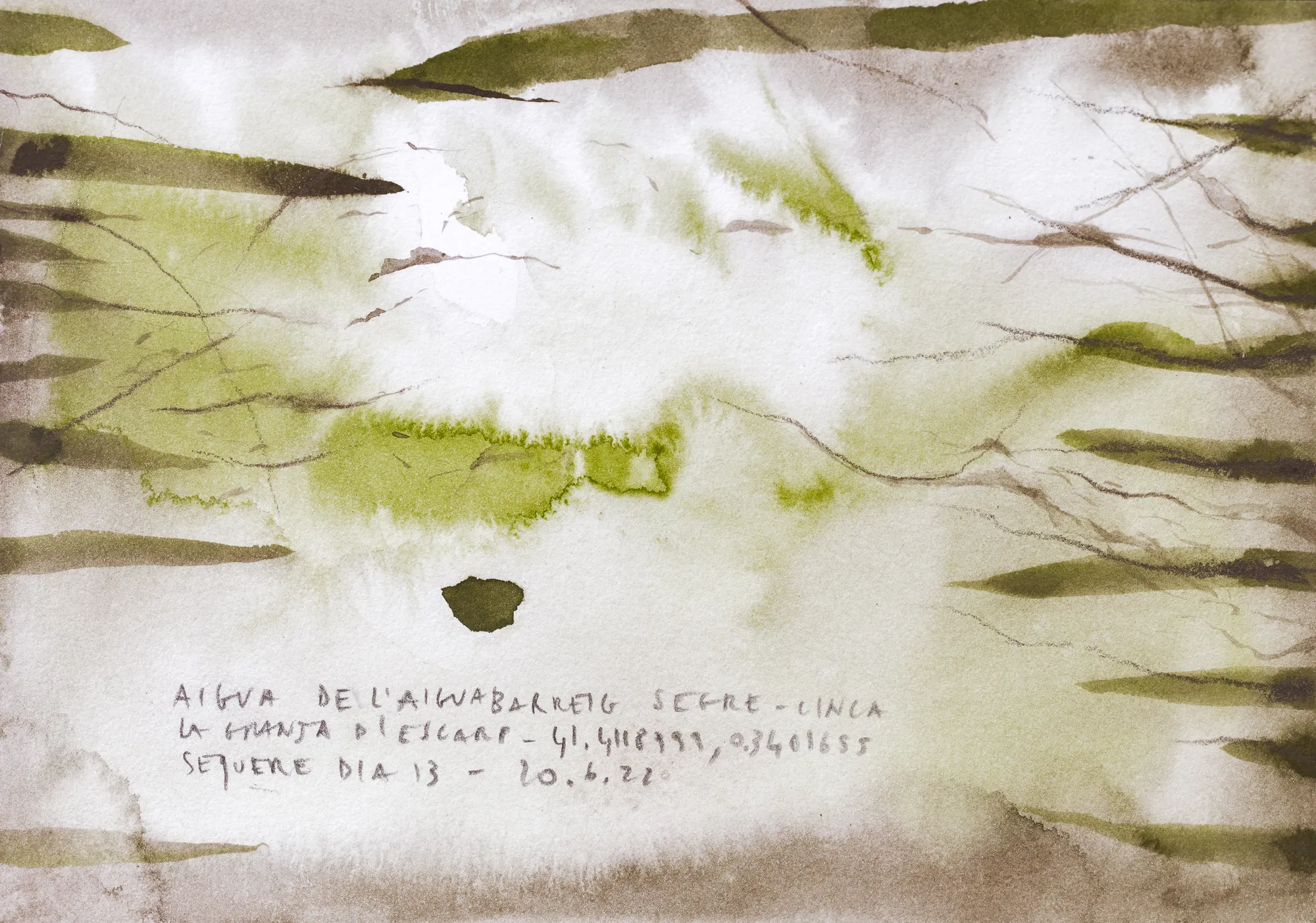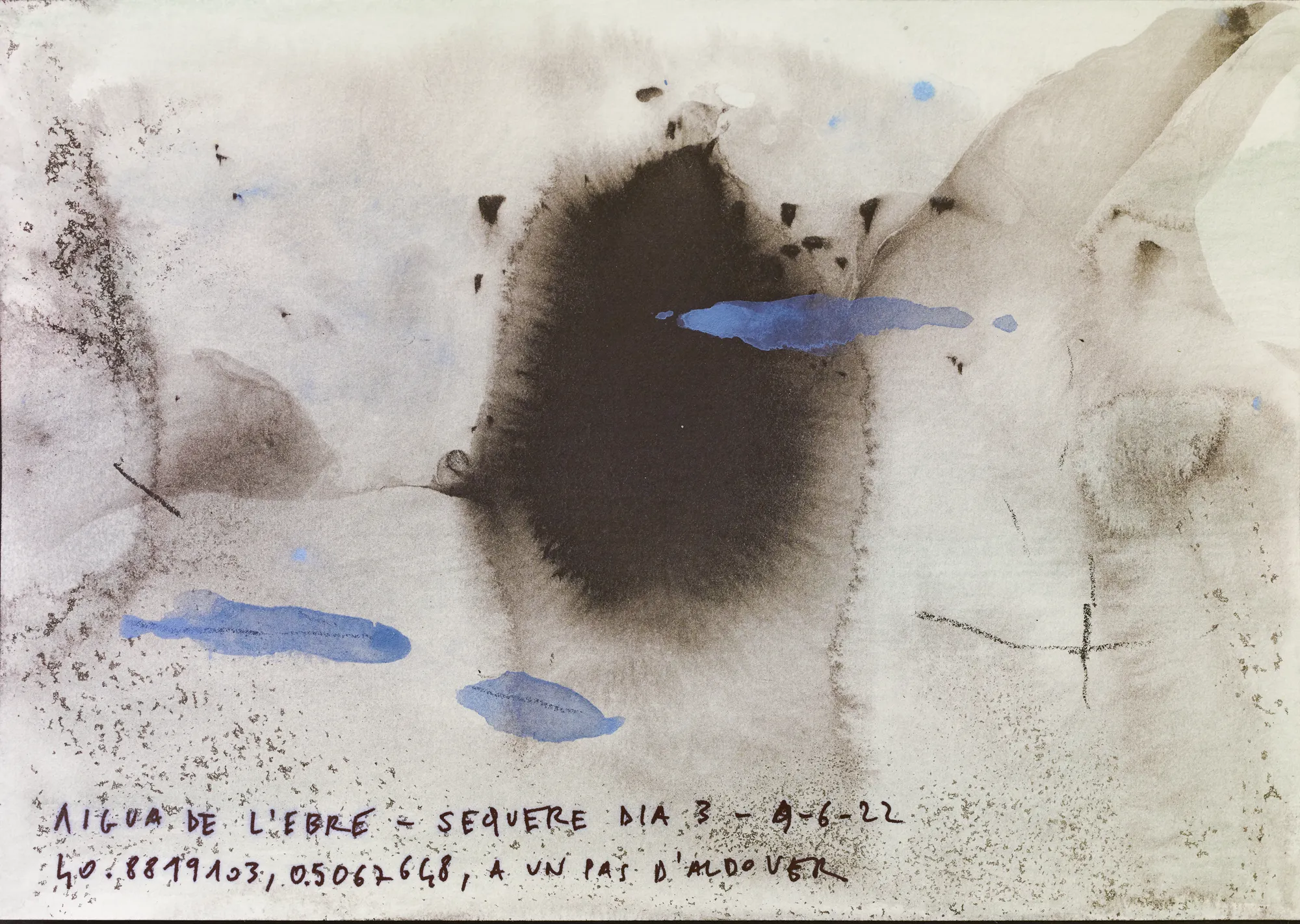 Esta serie de acuarelas, realizadas con agua de ríos durante las travesías de Sequere (2022) y Cos d’Ebre (2025), intenta fijar la memoria del río, material y simbólicamente, en el papel.