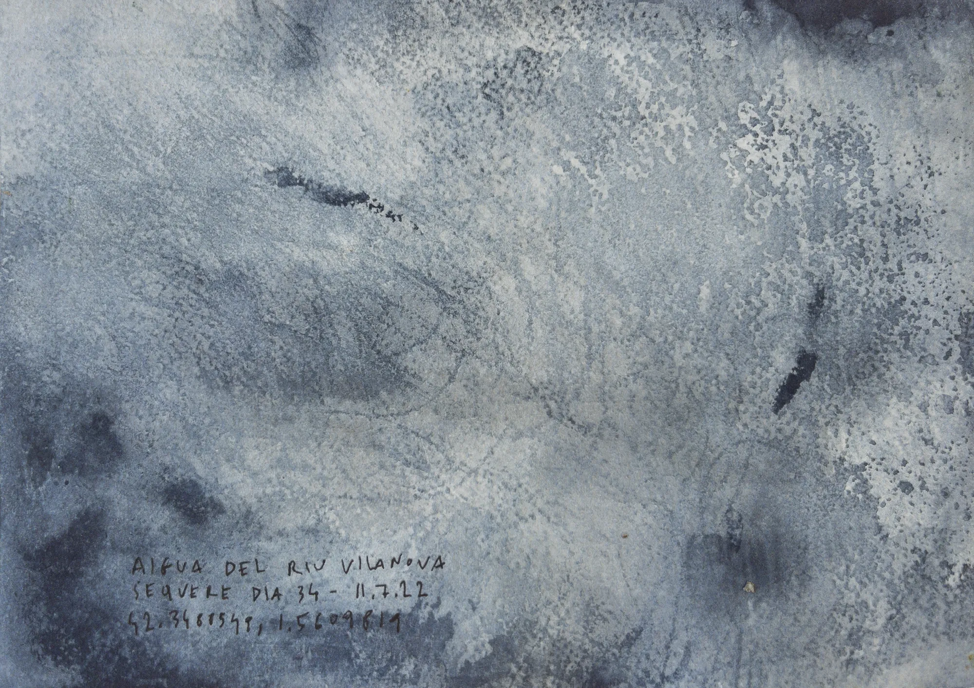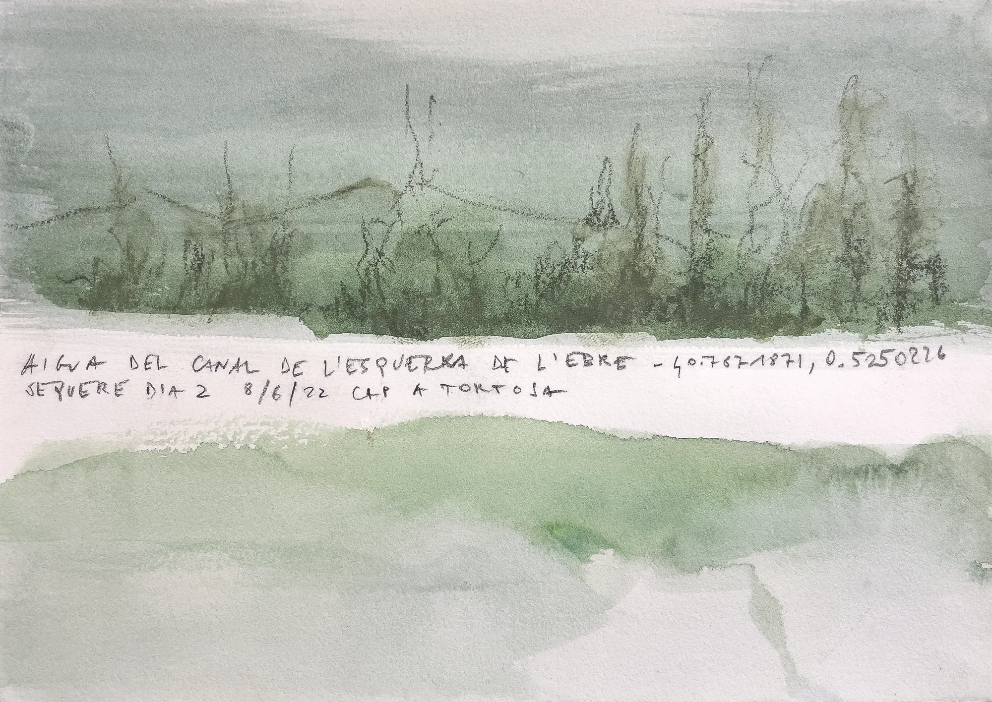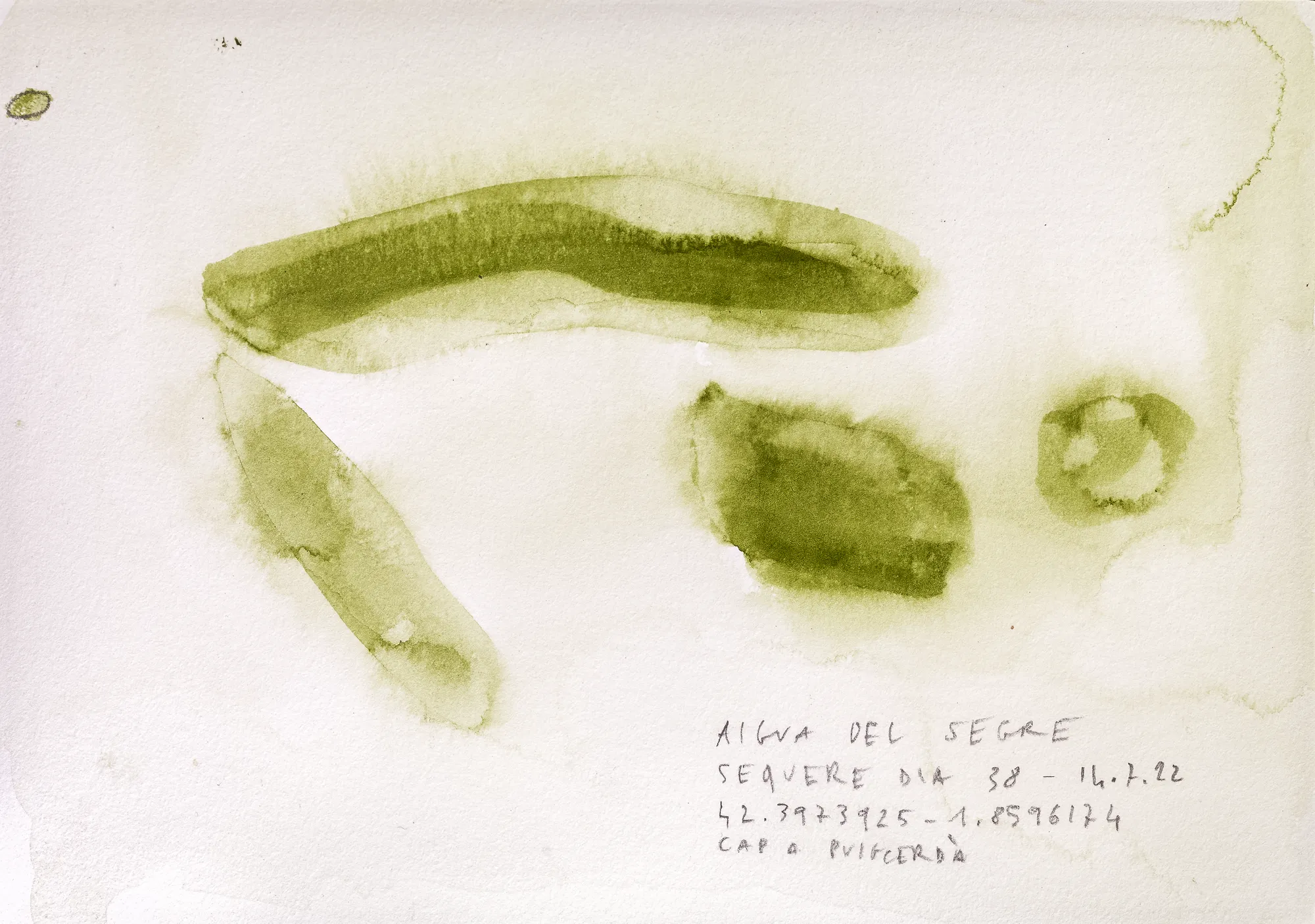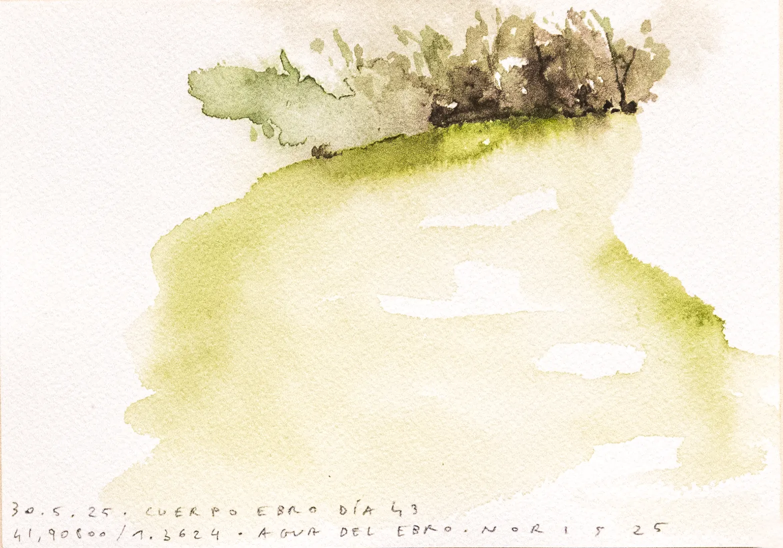 Esta serie de acuarelas, realizadas con agua de ríos durante las travesías de Sequere (2022) y Cos d’Ebre (2025), intenta fijar la memoria del río, material y simbólicamente, en el papel.