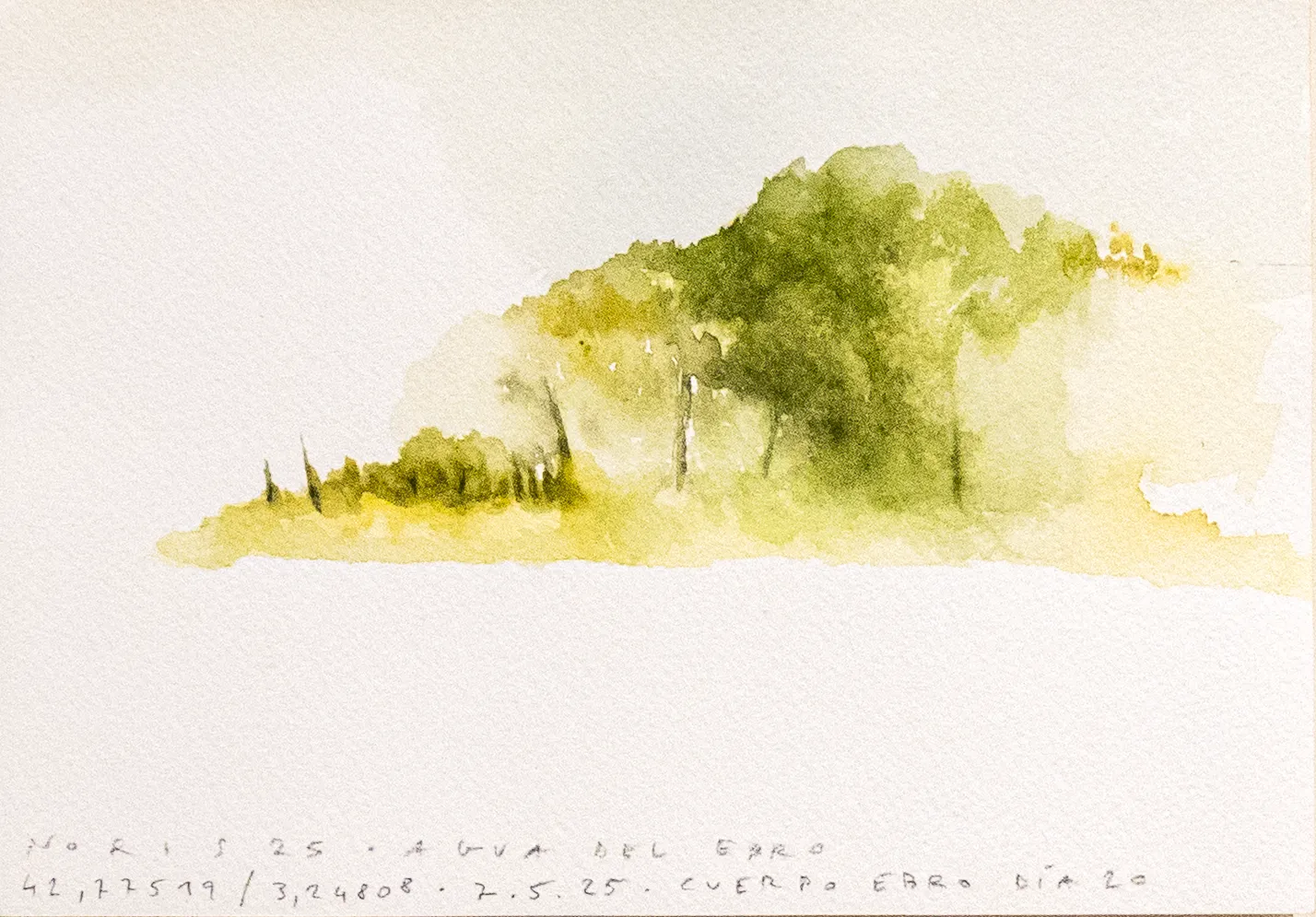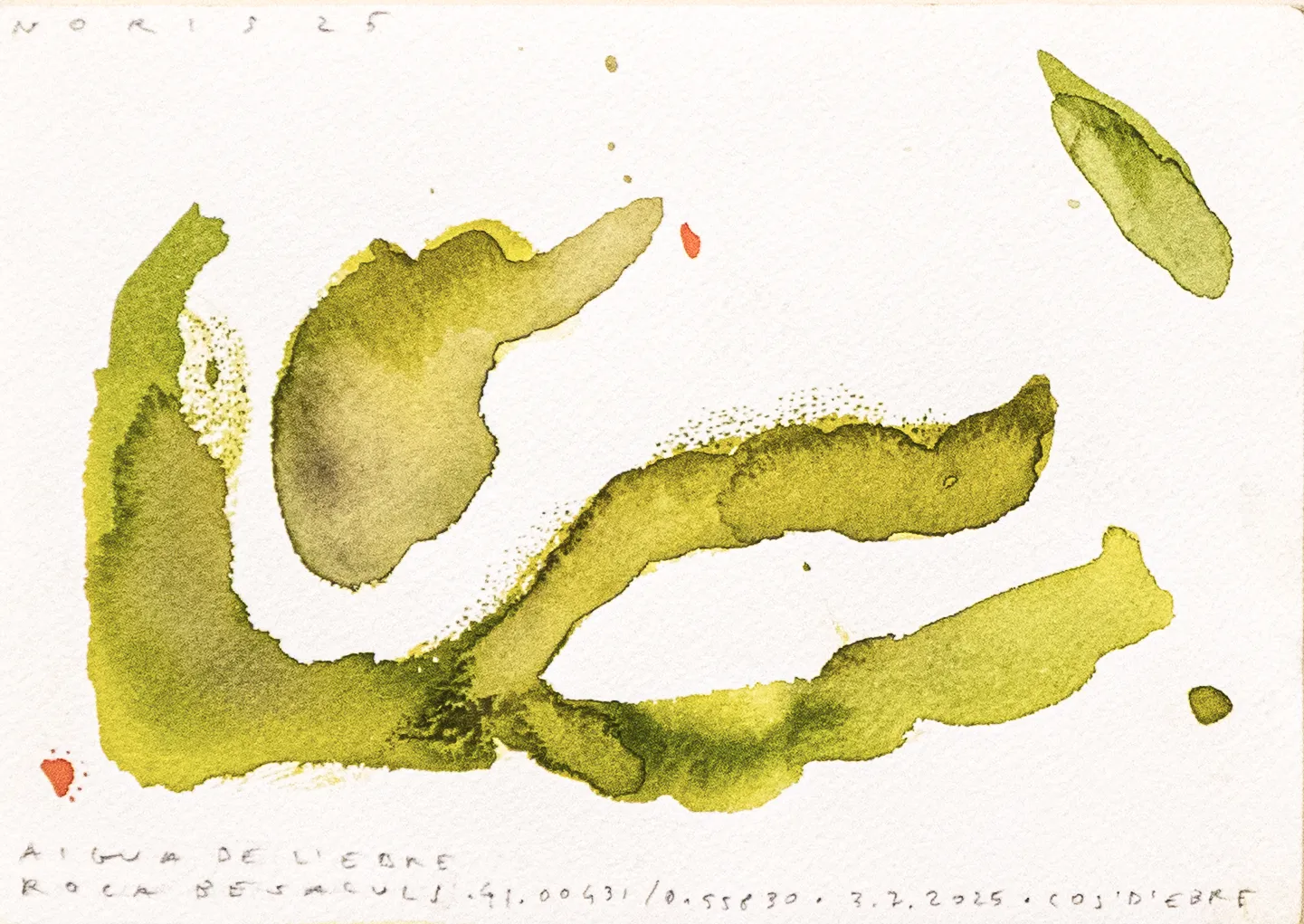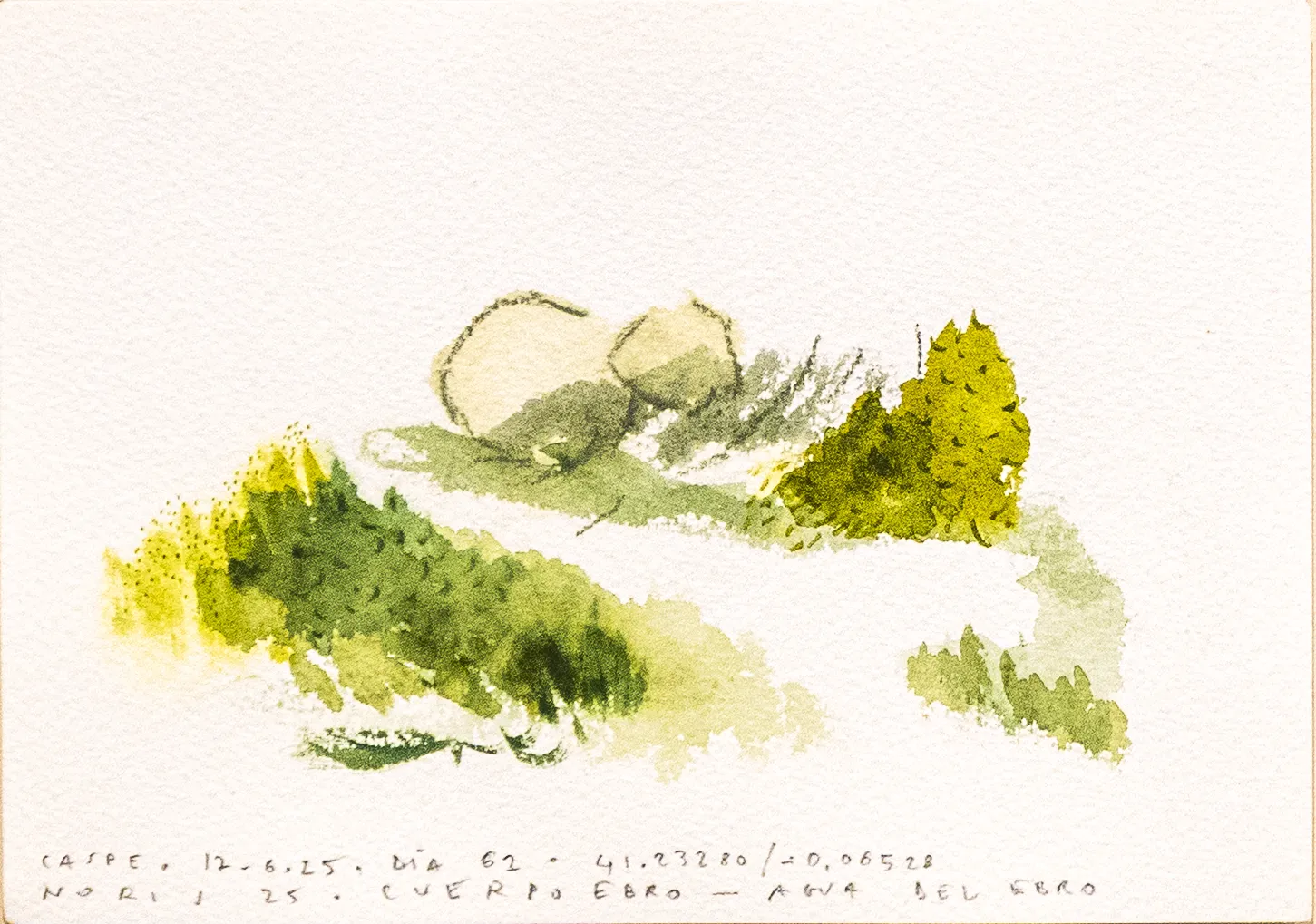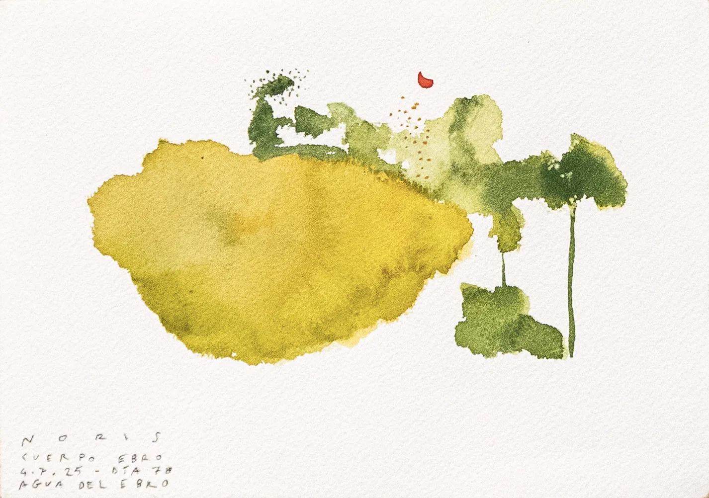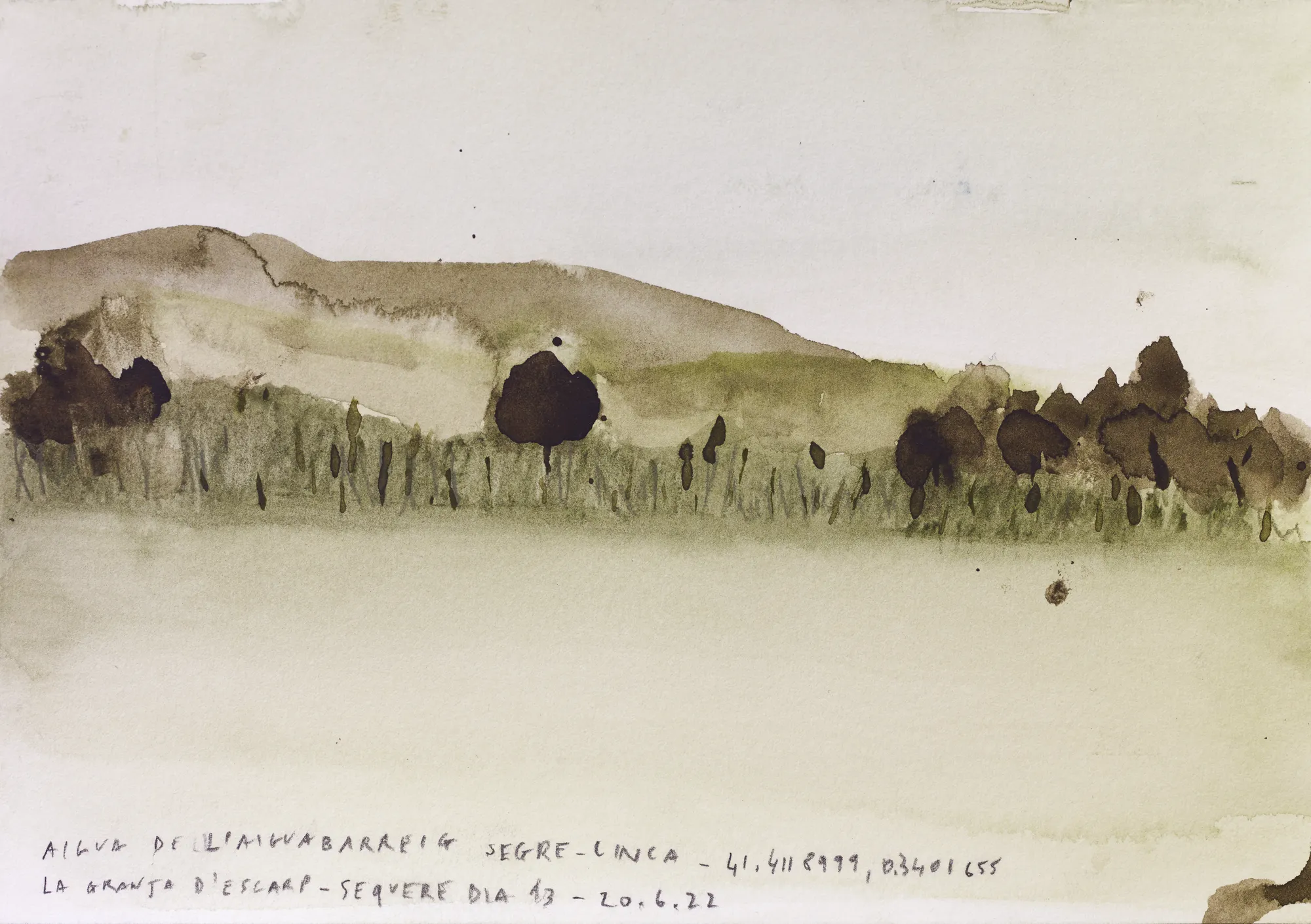Esta serie de acuarelas, realizadas con agua de ríos durante las travesías de Sequere (2022) y Cos d’Ebre (2025), intenta fijar la memoria del río, material y simbólicamente, en el papel.