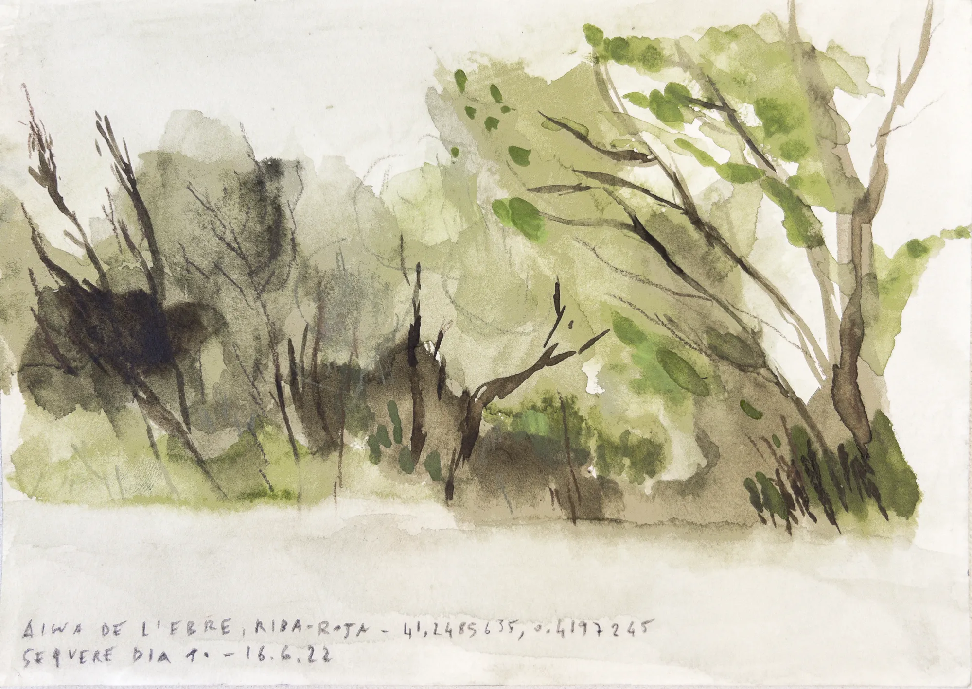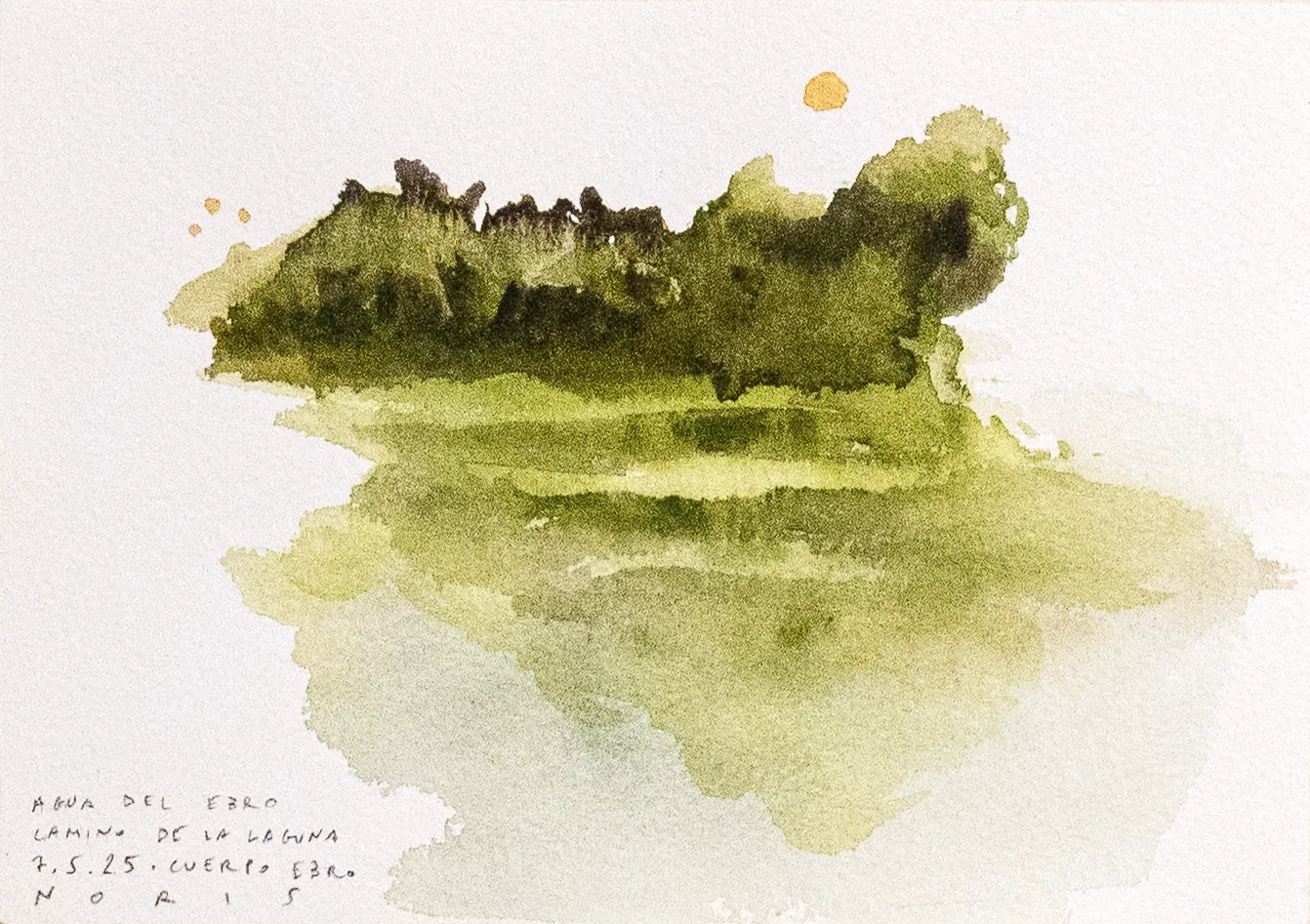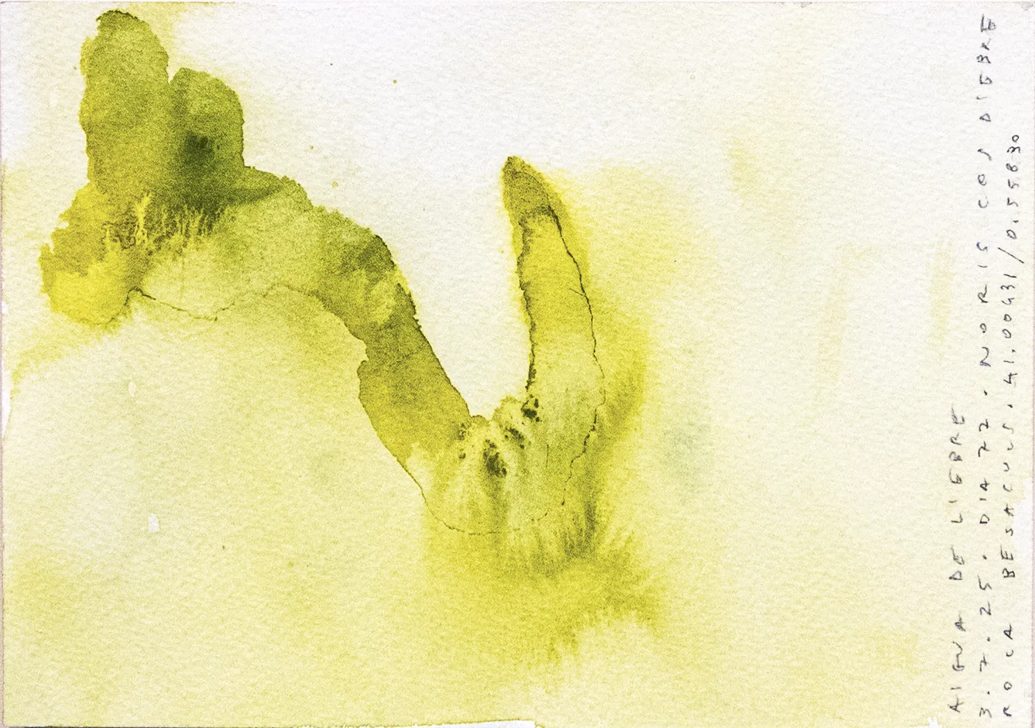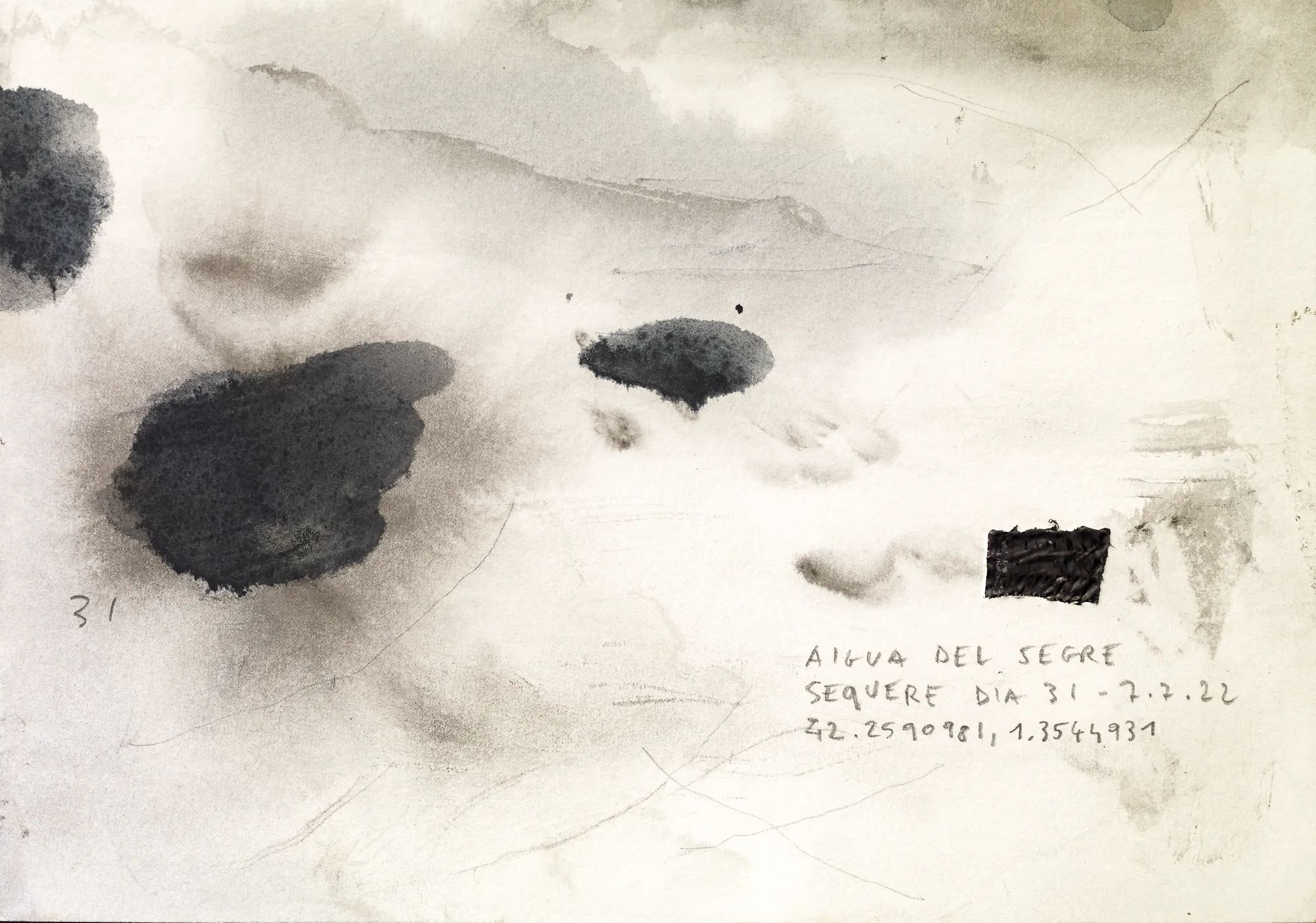 Esta serie de acuarelas, realizadas con agua de ríos durante las travesías de Sequere (2022) y Cos d’Ebre (2025), intenta fijar la memoria del río, material y simbólicamente, en el papel.